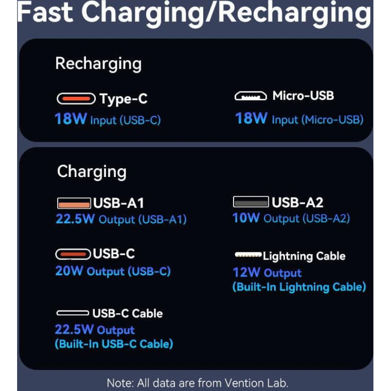 summary: Vention FHPW0. Battery capacity: 20000 mAh, Battery voltage: 3.7 V. USB Type-A output ports: 2, USB Type-C ports quantity: 1. Total output power: 22.5 W. Product colour: White
