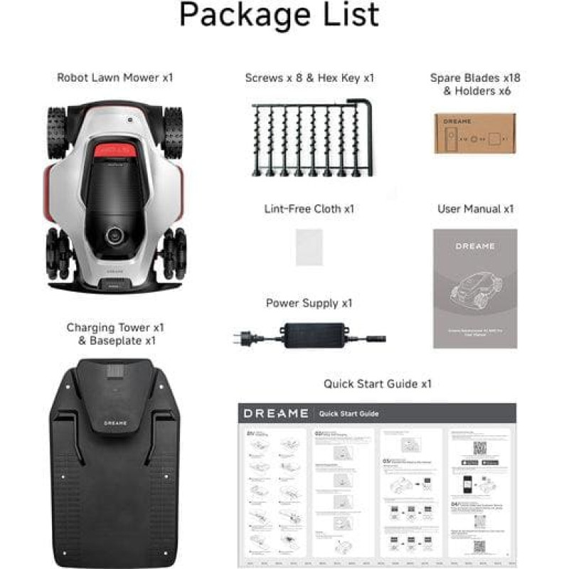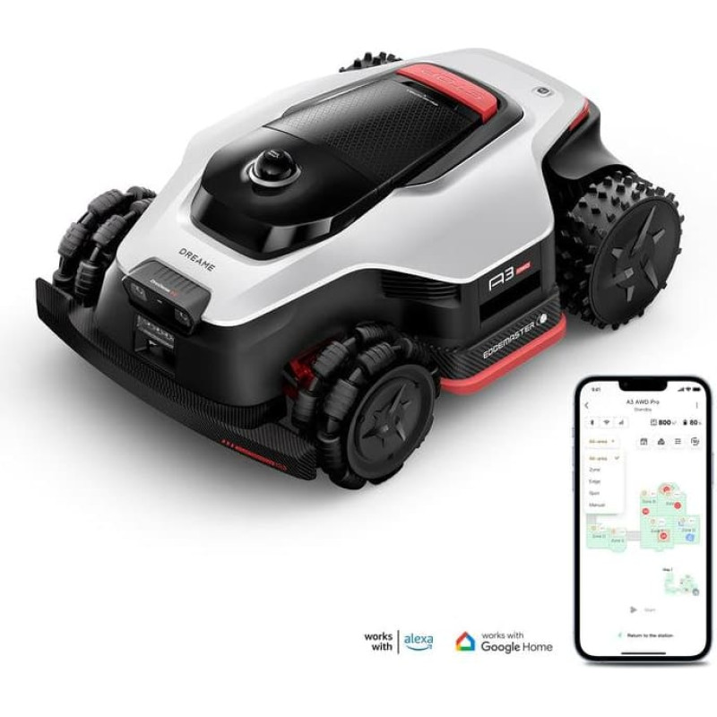 summary: Dreame A3 AWD Pro. Type: Robotic lawn mower, Maximum lawn area: 2500 m², Cutting width: 4 cm. Navigation type: LIDAR. Power source: Battery, Charging current: 5 A, Battery type: Built-in battery. Width: 740 mm, Depth: 532 mm, Height: 325 mm