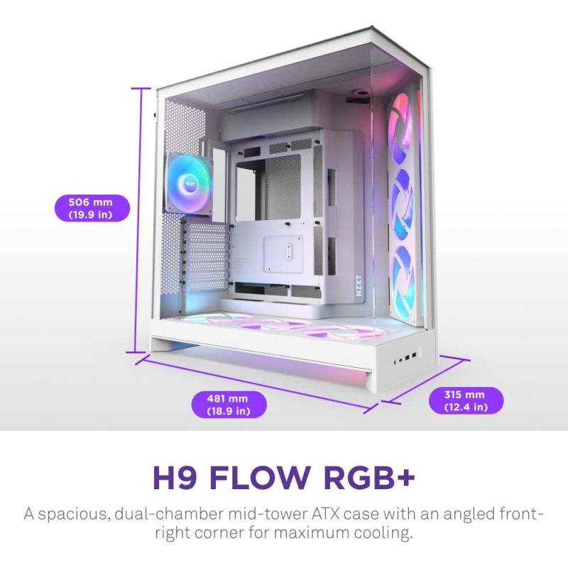 summary: NZXT H9 Flow RGB. Form factor: Midi Tower, Type: PC, Product colour: White. Front fans installed: 3x 140 mm, Front fans diameters supported: 120,140 mm, Rear fans installed: 1x 120 mm. Supported HDD sizes: 2.5,3.5". Width: 315 mm, Depth: 481 mm, Height: 506 mm