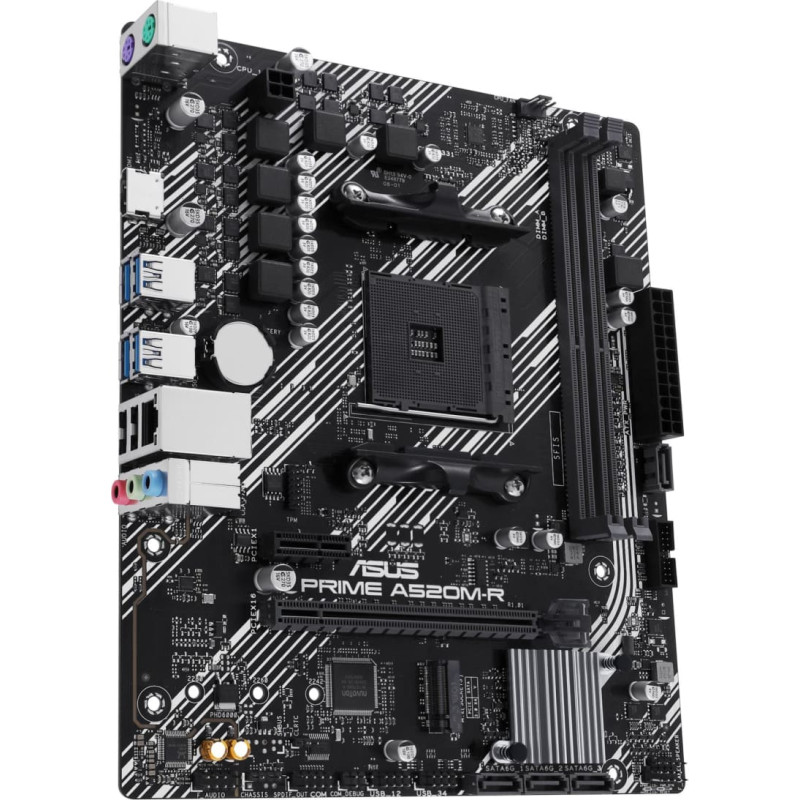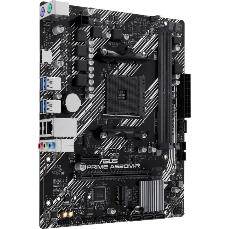 summary: ASUS PRIME A520M-R. Processor manufacturer: AMD, Processor socket: Socket AM4, Compatible processor series: AMD Ryzen 3000 Series, AMD Ryzen 5000 Series. Supported memory types: DDR5-SDRAM, Maximum internal memory: 64 GB, Memory slots type: DIMM. Supported storage drive interfaces: M.2, SATA III, Supported storage drive types: HDD & SSD, RAID levels: 0, 1, 10. Ethernet interface type: Gigabit Ethernet. Component for: PC, Motherboard form factor: micro ATX, Motherboard chipset family: AMD
