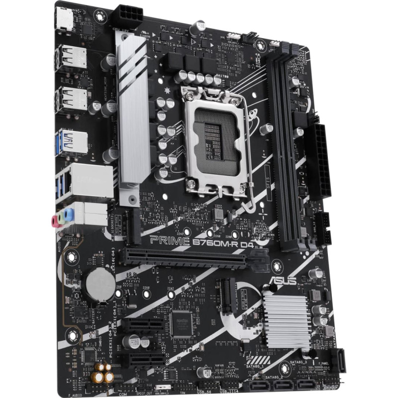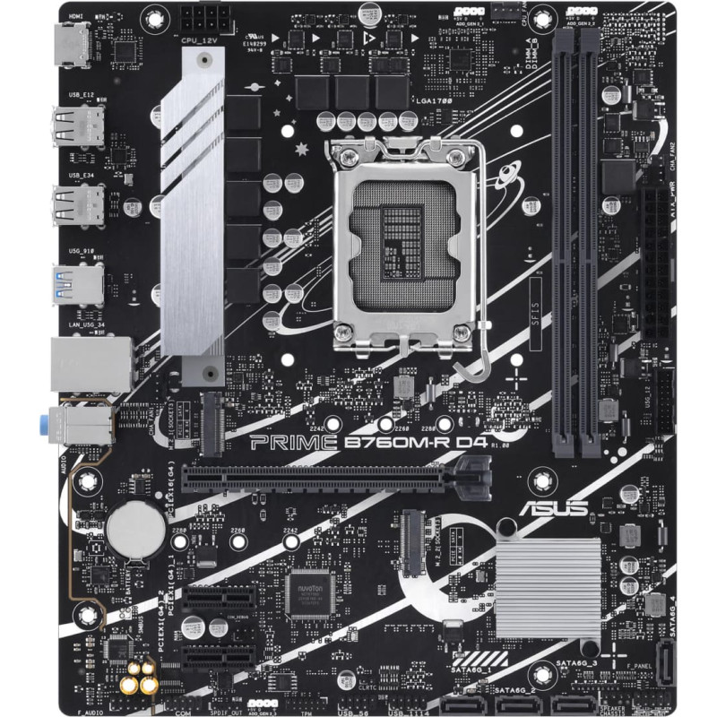 summary: ASUS PRIME B760M-R D4. Processor manufacturer: Intel, Processor socket: LGA 1700, Compatible processor series: Intel Core i9 14th Gen, Intel Core i3 12th Gen, Intel Core i3 13th Gen, Intel Core i5 12th Gen,.... Supported memory types: DDR4-SDRAM, Maximum internal memory: 64 GB, Memory slots type: DIMM. Supported storage drive interfaces: M.2, SATA III, Supported storage drive types: HDD & SSD, RAID levels: 0, 1, 5, 10. Ethernet interface type: 2.5 Gigabit Ethernet. Component for: PC, Motherboard form factor: micro ATX, Motherboard chipset family: Intel