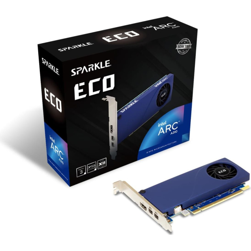 summary: Sparkle Technology Intel Arc A310 ECO. Graphics processor family: Intel, Graphics processor: Arc A310, Processor frequency: 1000 MHz. Discrete graphics card memory: 4 GB, Graphics card memory type: GDDR6, Memory bus: 64 bit. Maximum resolution: 7680 x 4320 pixels. DirectX version: 12 Ultimate, OpenGL version: 4.6. Interface type: PCI Express 4.0. Cooling type: Active, Number of fans: 1 fan(s)