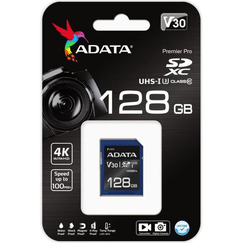summary: ADATA ASDX128GUI3V30S-R. Capacity: 128 GB, Flash card type: SDXC, Flash memory class: Class 10, Internal memory type: UHS-I, Read speed: 100 MB/s, Write speed: 60 MB/s, UHS Speed Class: Class 3 (U3), Video Speed Class: V30. Product colour: Black, Blue
