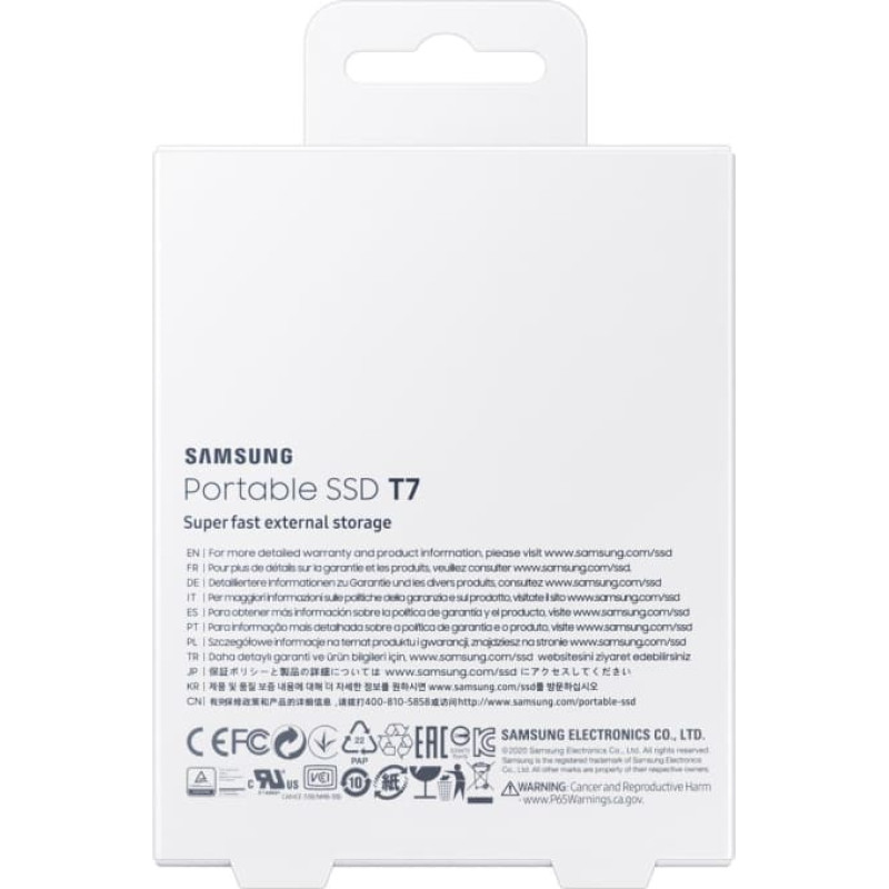 summary: Samsung Portable SSD T7. SSD capacity: 1 TB. USB connector: USB Type-C, USB version: 3.2 Gen 2 (3.1 Gen 2). Read speed: 1050 MB/s, Write speed: 1000 MB/s. Password protection. Product colour: Grey