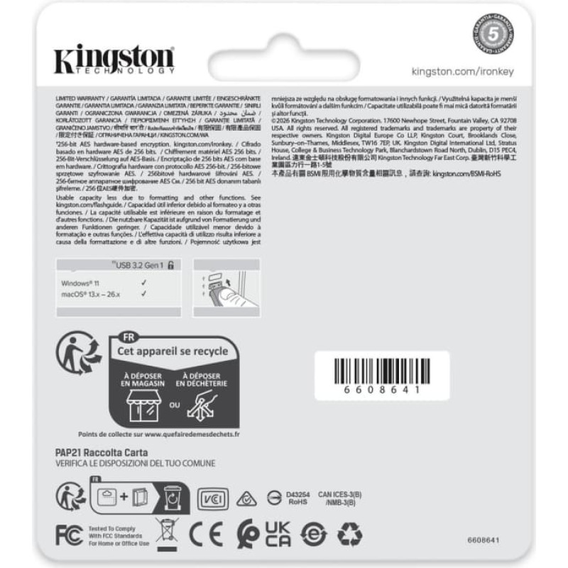 summary: Kingston Technology IronKey 256GB Locker Plus 50 G2, FIPS 197, AES-256. Capacity: 256 GB, Device interface: USB Type-A, USB version: 3.2 Gen 1 (3.1 Gen 1), Read speed: 145 MB/s, Write speed: 115 MB/s. Form factor: Cap. Weight: 22.94 g. Product colour: Black