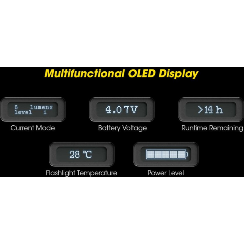 Advanced Temperature Regulation (ATR): Nitecore's ATR module regulates the output based on the working conditions and ambient temperature to prevent overheating and maintain optimal performance. The OLED display also shows the temperature.