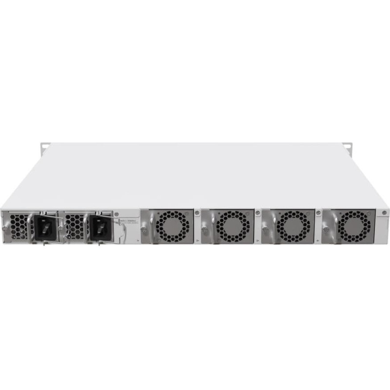 There are 2x QSFP28 cages for blazing-fast 100 Gigabit connectivity, 12x SFP28 cages for 25 Gigabit networking, and a Gigabit Ethernet port. The device comes with 16 GB of RAM, decent NAND storage, and two M.2 SATA slots for additional storage. There are four hot-swappable fans, as well as dual-redundant hot-swap power supplies. And these PSUs might look familiar if you have used our CCR1072 before: you can keep using your previous hot-swap power supplies and SFP modules.