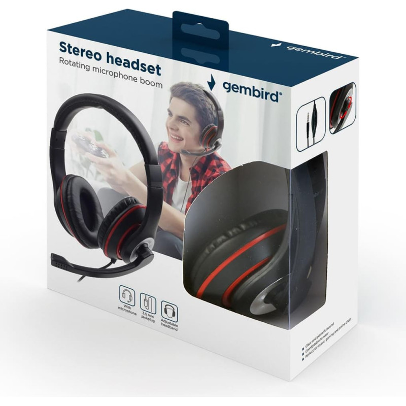 summary: Gembird MHS-03-BKRD. Product type: Headset. Connectivity technology: Wired. Recommended usage: Gaming. Headphone frequency: 20 - 20000 Hz. Cable length: 1.8 m. Weight: 200 g. Product colour: Black, Red