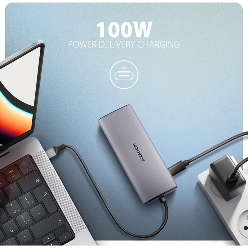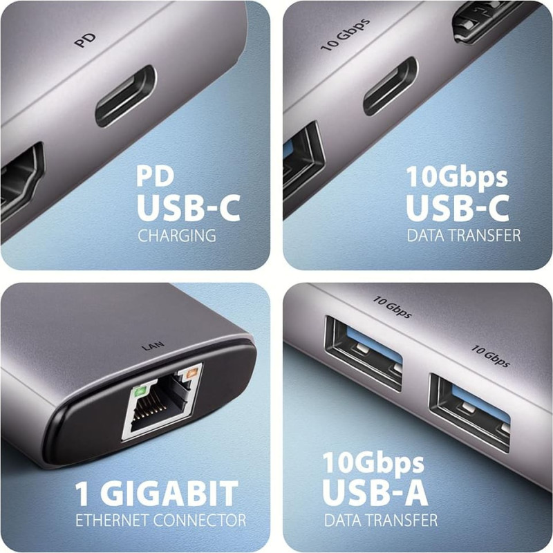 The multi-port USB-C 10Gbps AXAGON HMC-6G2L hub 6in1 expands your laptop, computer or phone with six ports. You can easily and quickly connect a monitor, three USB devices and a Gigabit Ethernet network to the computer at the same time via the double-sided USB-C connector. You also get the possibility to supply laptop using Power Delivery technology at the same time. The port replicator will thus provide you with a simple and compact 6-in-1 docking station not only for Windows laptops but also for Apple laptops such as MacBook Air or MacBook Pro. The USB hub offers three USB 10Gbps outputs. Two with standard USB-A and third with USB-C data connector. With the advanced USB 3.2 Gen 2 standard, you can connect high-speed devices such as NVMe M.2 external drives to all outputs at up to 2x the speed of 10 Gb/s compared to standard Gen 1 hubs with only 5 Gbps. The hub can permanently connect several external drives simultaneously and also allows charging of phones and tablets with up to 1.5A/5V current. From the hub, you can easily charge e.g. Android smartphone, Apple iPhone, Apple iPad etc. Another USB-C (PD) connector is reserved only for charging phones or laptops using Power Delivery 3.0 technology with up to 100W of power. Connect a suitable USB-C Power Delivery charger into the hub and connect the hub to a laptop that supports Power Delivery. This saves one USB-C port. HDMI output provides high quality image up to 4K/60Hz Ultra HD resolution and supports multi-channel audio transmission. High frequencies at popular gaming resolutions of 2K/120Hz or FullHD/240Hz are also supported. Thanks to HDR (high dynamic range) support, you can enjoy a significantly expanded range of colours and contrasts. For video outputs to work properly, the laptop must have a USB-C port with DisplayPort Alternate Mode (DP Alt Mode) support or a Thunderbolt 3, 4 port and above. Gigabit network card extends your computer by a fast and stable network connection, adds the missing RJ-45 network connector or another network card. The compact and slim aluminium body not only looks great, but also provides mechanical durability and passive cooling. You will also be pleased with the finely textured surface, which does not leave fingerprints. You can use your current USB peripherals without having to purchase new ones. Thanks to the Plug and Play and Hot Plug functions, connecting the hub itself is very simple without complicated installation, and peripherals can also be easily connected and disconnected while the computer is running. The hub does not afraid of connection to phones with a USB-C connector. For example, you can connect a flash drive, keyboard, mouse, display, TV or projector to the phone. Input (connection to laptop): Input (power supply): USB outputs: Video output: RJ-45 output: Other features: Supported operating systems: Package contains: Manufacturer Website: https://www.axagon.eu/en/produkty/hmc-6g2l |