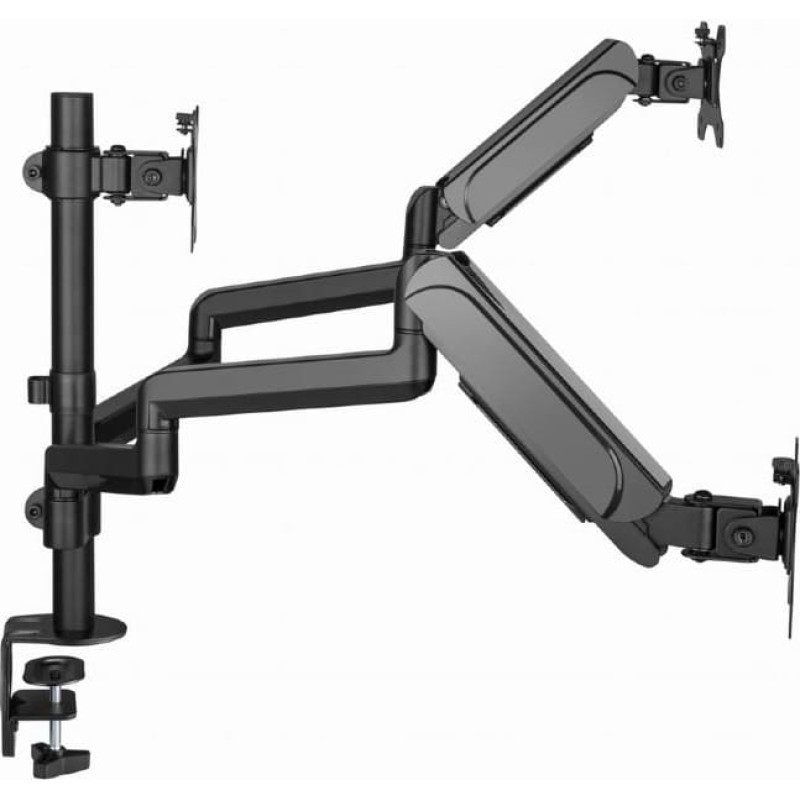 Two arms rotate, extend and retract, tilt to change reading angles, and allow to rotate displays from landscape-to-portrait mode, etc