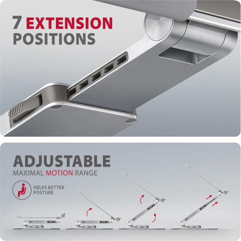 Aluminum stand with 360° rotation for laptops 10" - 17.3". Adjustable height and angle.