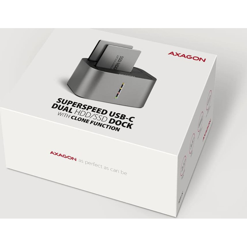 SuperSpeed USB-C 5Gbps docking / cloning station AXAGON ADSA-DC DUAL CLONE easily and quickly connects up to two 2.5" or 3.5" drives to the computer at the same time. The connection to the computer is enabled by the modern double-sided USB-C connector on the dock together with the supplied USB-C <-> USB-A cable with a length of 80 cm.