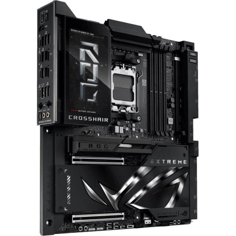 The ROG Crosshair X870E Extreme is the flagship AMD Ryzen™ 9000 series motherboard, designed for the most discerning users. It provides the ultimate foundation for AM5 CPUs, DDR5 memory, and PCIe® 5.0 components to ensure maximum performance and future-readiness. Its comprehensive connectivity includes USB4®, and the integrated 5-inch LCD offers a unique way to monitor system performance or add a touch of personalized style.