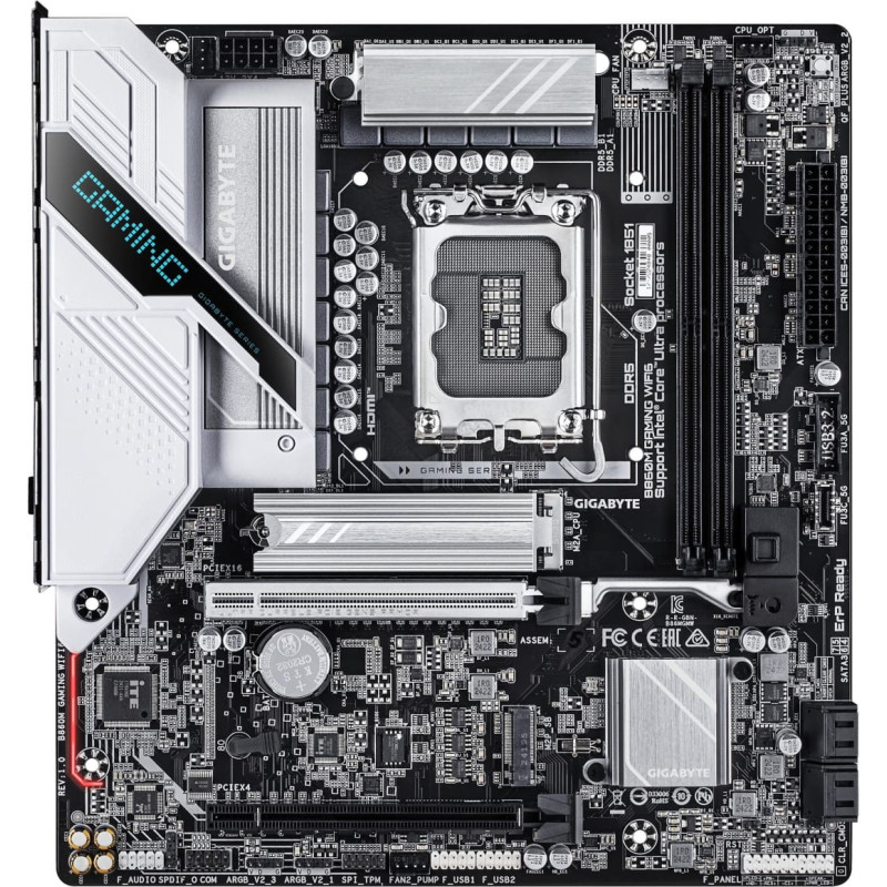 summary: GIGABYTE B860M GAMING WIFI6 Motherboard - Intel Core Ultra Series CPUs, 8+1+2 Phases VRM, up to 9066MHz DDR5, 1xPCIe 5.0 + 1xPCIe 4.0 M.2, 2.5GbE LAN, WIFI 6, USB 4. Processor manufacturer: Intel, Processor socket: LGA 1851 (Socket V1), Compatible processor series: Intel® Core™ Ultra (Series 1), Intel Core Ultra (Series 2). Supported memory types: DDR5-SDRAM, Maximum internal memory: 128 GB, Memory slots type: DIMM. Supported storage drive interfaces: M.2, SATA III, Supported storage drive types: HDD & SSD, RAID levels: 0, 1, 5, 10. Maximum resolution: 4096 x 2160 pixels. Ethernet interface type: 2.5 Gigabit Ethernet, LAN controller: Realtek RTL8125, Top Wi-Fi standard: Wi-Fi 6E (802.11ax)