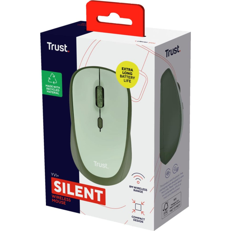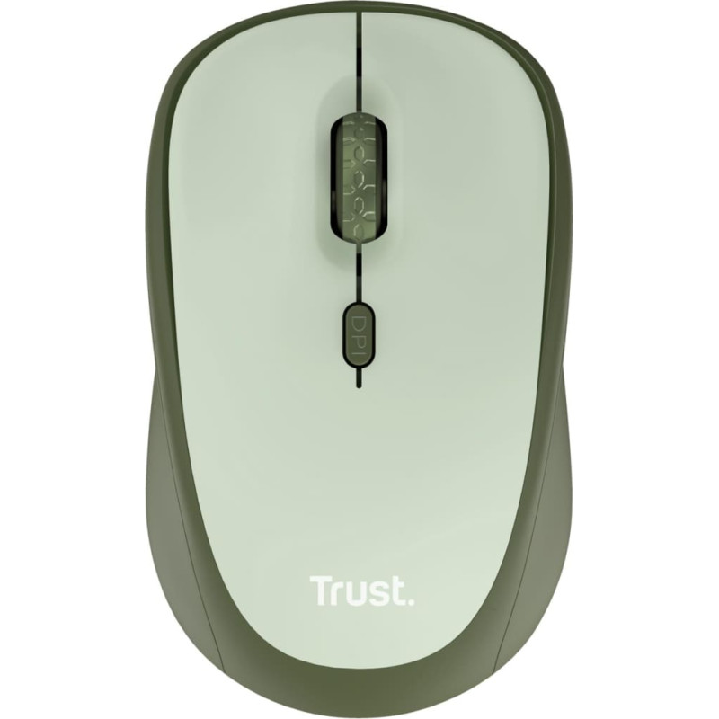 summary: Trust Yvi+. Form factor: Right-hand. Movement detection technology: Optical, Device interface: RF Wireless, Movement resolution: 1600 DPI, Buttons type: Pressed buttons, Buttons quantity: 4, Scroll type: Wheel. Power source: Batteries. Product colour: Black, Green