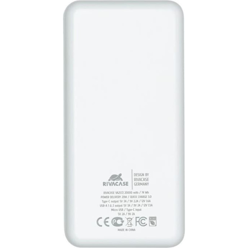 VA2572 (20000 mAh) white, QC/PD portable battery Manufacturer Website: https://rivacase.com/en/products/power-accessories/portable-rechargeable-batteries/VA2572-20000-mAh-White-EU-QCPD-portable-battery |