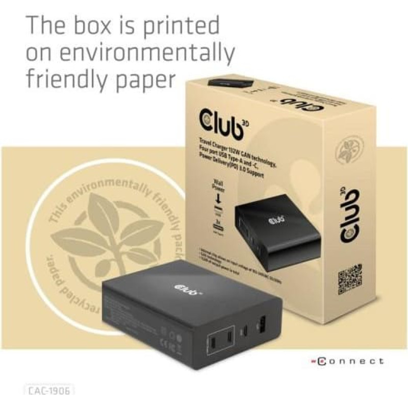 The Club 3D CAC-1906 Travel Charger 132W GAN technology, Four port USB Type-A and -C, Power Delivery(PD) 3.0 Support. This product is a high-performance, low weight travel charger with a maximum output power of 132W. Equipped with 3 USB Type-C ports and 1 Type-A port, the total output supports up to 132W, which can meet the needs of charging four devices at the same time. Compatible with multiple devices (support mobile phones,tablets and laptops). It is a convenient companion during travel and for business! Compact size & Superior Performance: GAN technology makes this charger 50% smaller than a 132W MacBook charger, small enough to carry anywhere.The 132W wall charger match a variety of PD devices from smart phones to laptops, one for all making charging simple. The Power Charger is light weight without compromising on Quality and safety. By adopting Power Delivery(PD) charging technology, this versatile Power Charger provides you with charging function through USB Type-C interface, you can charge any connected Mobilephone / Tablet / NoteBook.