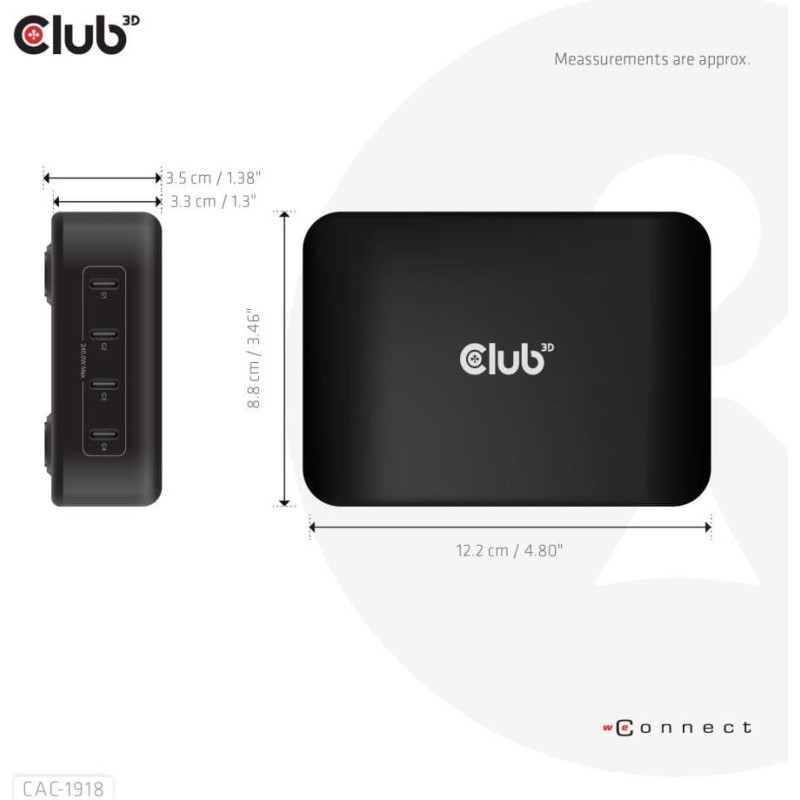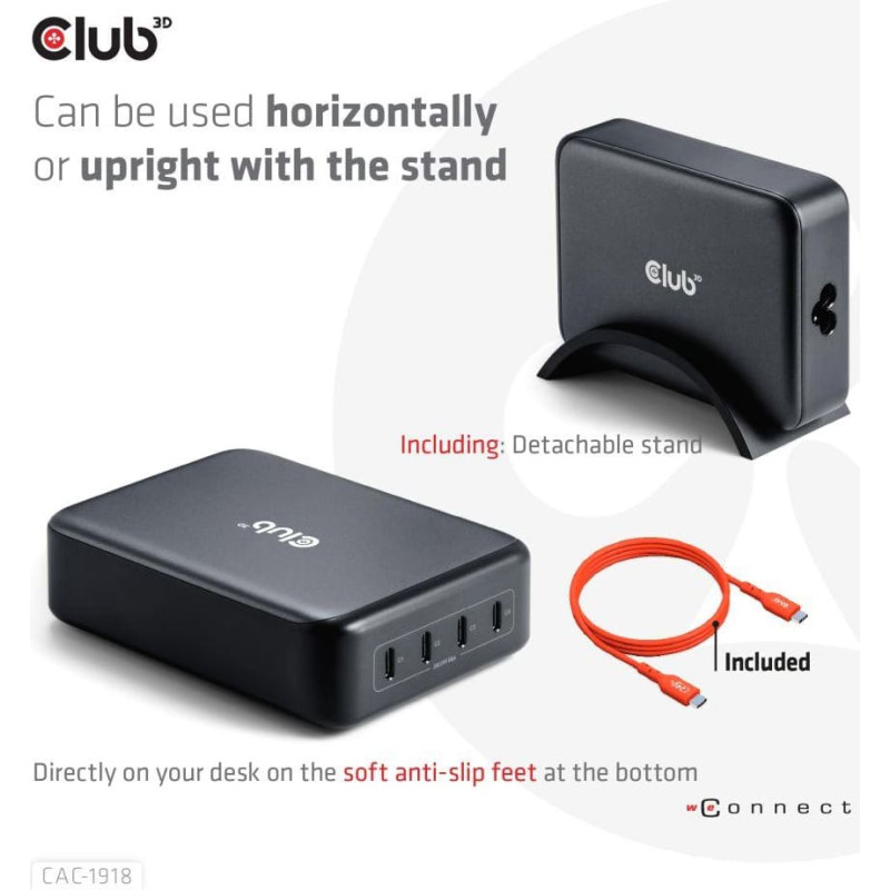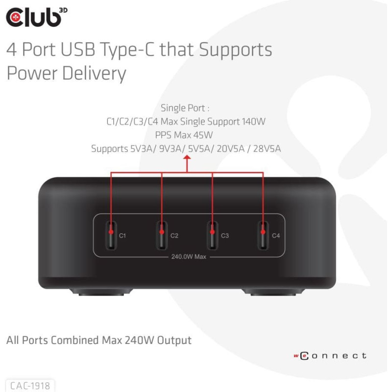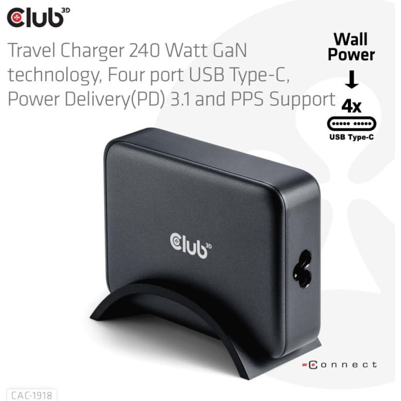 Travel Charger 240 Watt GaN technology, Four port USB Type-C, Power Delivery(PD) 3.1 and PPS Support. Manufacturer Website: https://www.club-3d.com/en/detail/2656/travel_charger_240_watt_gan_technology_four_port_usb_type_c_power_delivery(pd)_3.1_and_pps_support/ |
