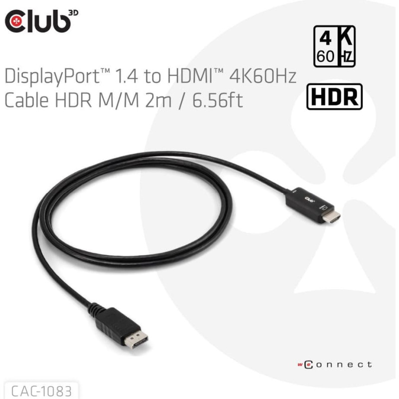 DisplayPort™ 1.4 to HDMI™ 4K60Hz Cable with HDR M/M 2 m / 6.56ft 32 AWG Manufacturer Website: https://www.club-3d.com/en/detail/2673/displayportt_1.4_to_hdmit_4k60hz_cable_with_hdr_m-m_2_m_-_6.56ft_32_awg/ |
