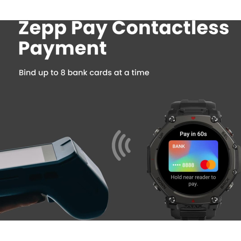 summary: Amazfit T-Rex 3 Pro. Display diagonal: 3.81 cm (1.5"), Display technology: AMOLED, Display resolution: 480 x 480 pixels, Touchscreen. Wi-Fi. GPS (satellite). Battery capacity: 700 mAh. Weight: 52 g. Band material: Silicone, Band colour: Black, Band size: One Size. Operating system installed: Zepp OS