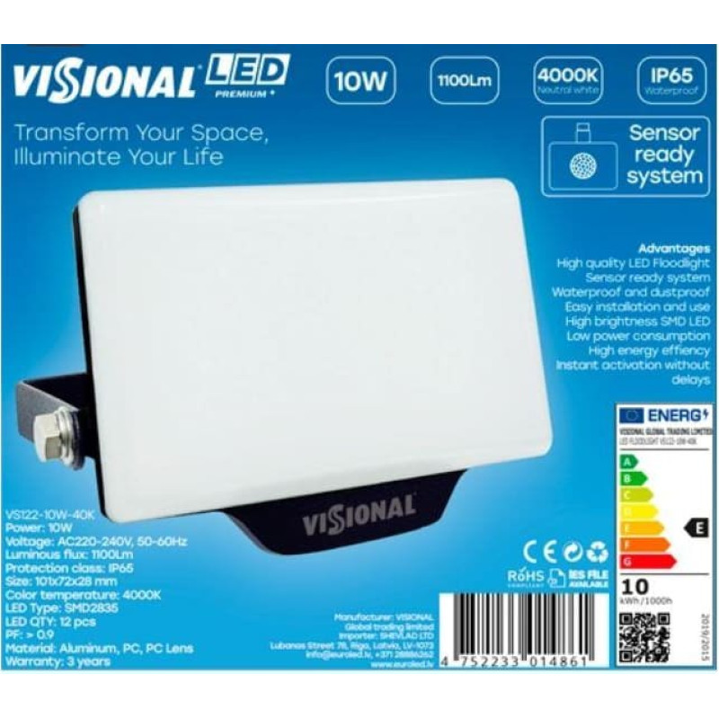 Visional Lamp|VISIONAL|Power consumption 10 Watts|Luminous flux 1100 Lumen|4000 K|AC220-240V|Beam angle 120 degrees|VS122-10W-40K