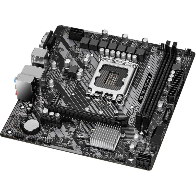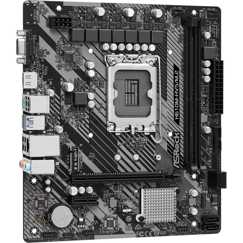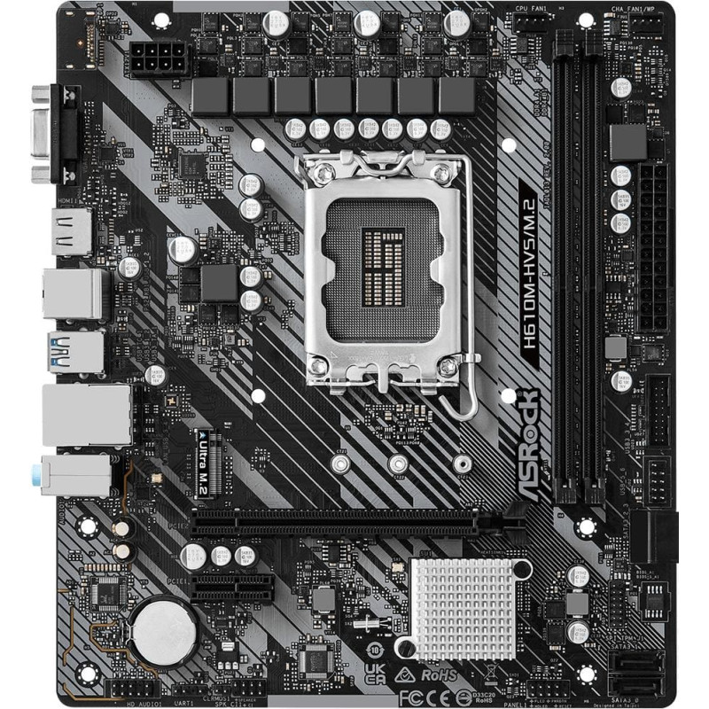 summary: Asrock H610M-HVS/M.2 R2.0. Processor manufacturer: Intel, Processor socket: LGA 1700, Compatible processor series: Intel® Core™ i3, Intel® Core™ i5, Intel® Core™ i7. Supported memory types: DDR4-SDRAM, Maximum internal memory: 64 GB, Memory slots type: DIMM. Supported storage drive interfaces: M.2, SATA III, Supported storage drive types: HDD & SSD. Maximum resolution: 4096 x 2160 pixels. Ethernet interface type: Gigabit Ethernet, LAN controller: Realtek RTL8111H