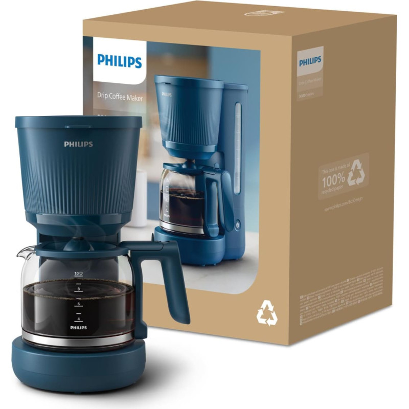 summary: Philips HD7411/70. Product type: Drip coffee maker, Coffee maker type: Manual, Water tank capacity: 1.38 L, Coffee input type: Ground coffee, Reservoir for brewed coffee: Jug, Capacity in cups: 10 cups. Power: 1080 W. Product colour: Blue