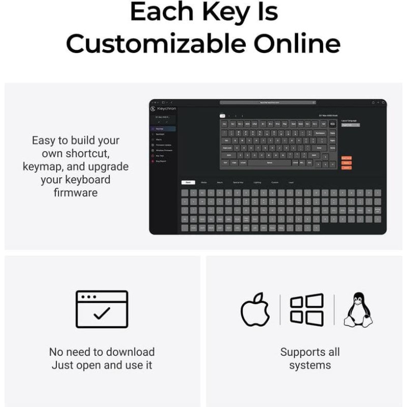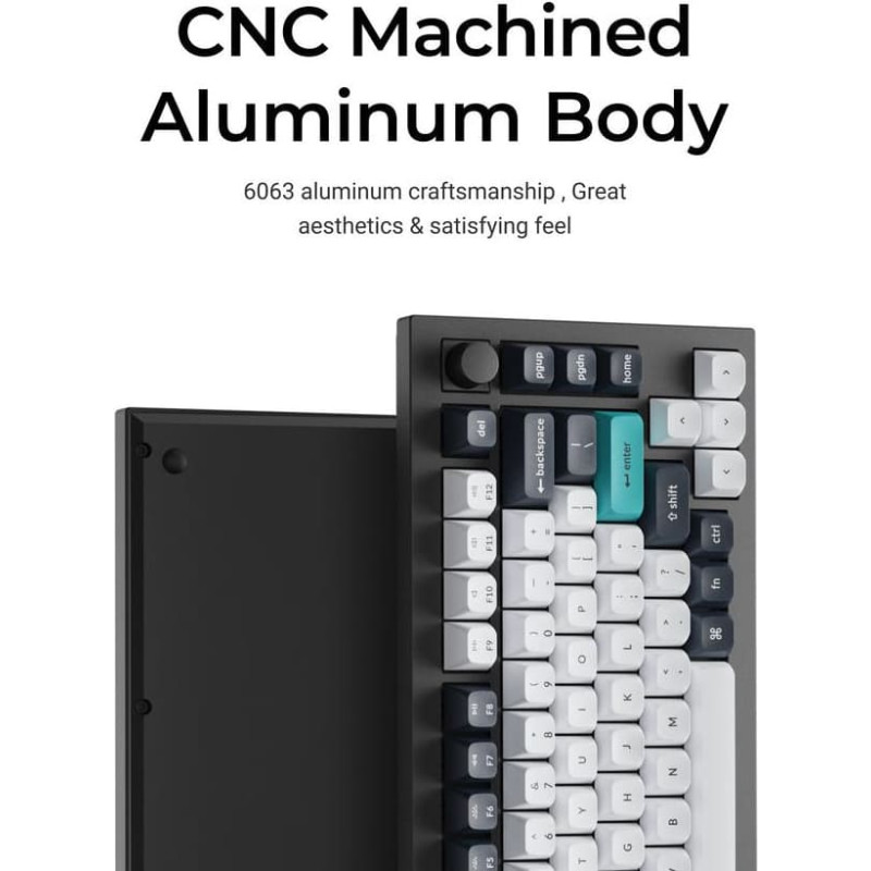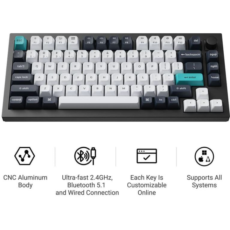 summary: Keychron Q1 Max. Keyboard style: Straight. Connectivity technology: Wired & Wireless, Device interface: USB + RF Wireless + Bluetooth, Keyboard key switch: Mechanical, Keyboard layout: QWERTY, Keyboard number of keys: 81. Backlight type: RGB LED. Recommended usage: Gaming. Product colour: Black, Cyan, Dark Blue, White