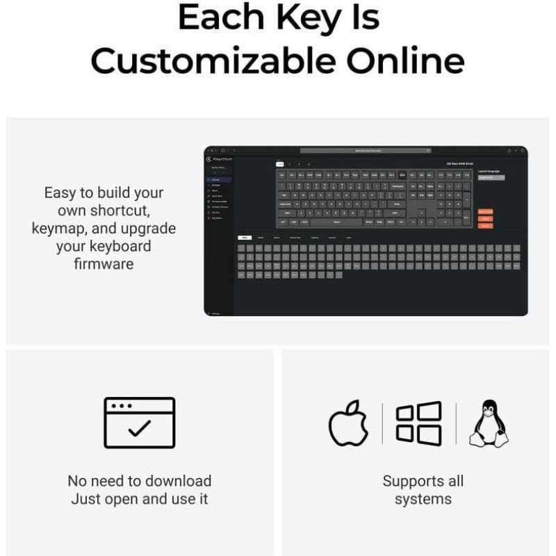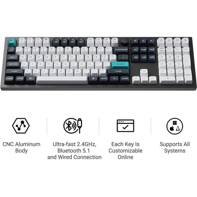 summary: Keychron Q6 Max. Keyboard form factor: Full-size (100%). Keyboard style: Straight. Connectivity technology: Wired & Wireless, Device interface: USB + RF Wireless + Bluetooth, Keyboard key switch: Mechanical, Keyboard layout: QWERTY, Keyboard number of keys: 108. Backlight type: RGB LED. Recommended usage: Universal. Product colour: Black