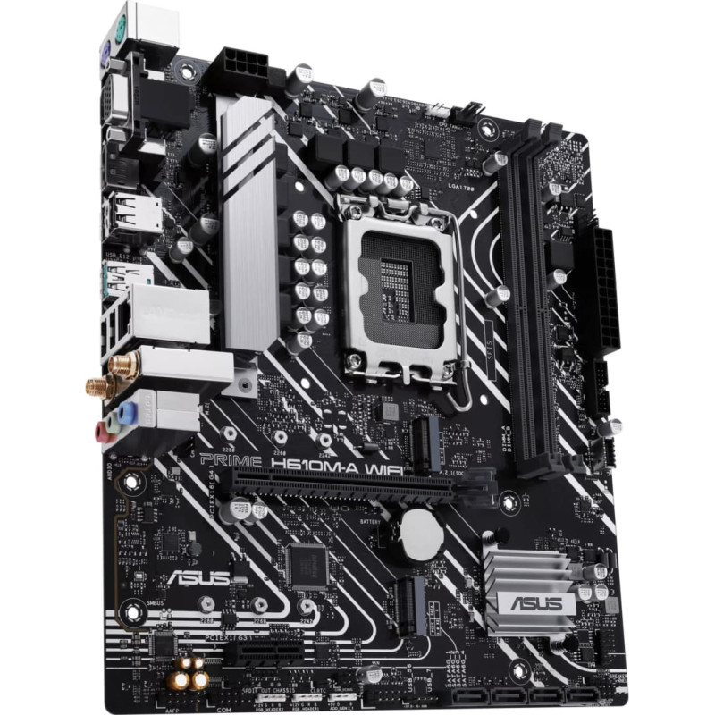 summary: ASUS PRIME H610M-A WIFI. Processor manufacturer: Intel, Processor socket: LGA 1700, Compatible processor series: Intel® Celeron®, Intel® Pentium® Gold, Intel® Core™ i3, Intel® Core™ i5, Intel® Core™.... Supported memory types: DDR5-SDRAM, Maximum internal memory: 96 GB, Memory slots type: DIMM. Supported storage drive interfaces: M.2, SATA III, Supported storage drive types: HDD & SSD. Ethernet interface type: Gigabit Ethernet, Top Wi-Fi standard: Wi-Fi 5 (802.11ac), Wi-Fi standards: 802.11a, 802.11b, 802.11g, Wi-Fi 4 (802.11n), Wi-Fi 5 (802.11ac). Component for: PC, Motherboard form factor: micro ATX, Motherboard chipset family: Intel