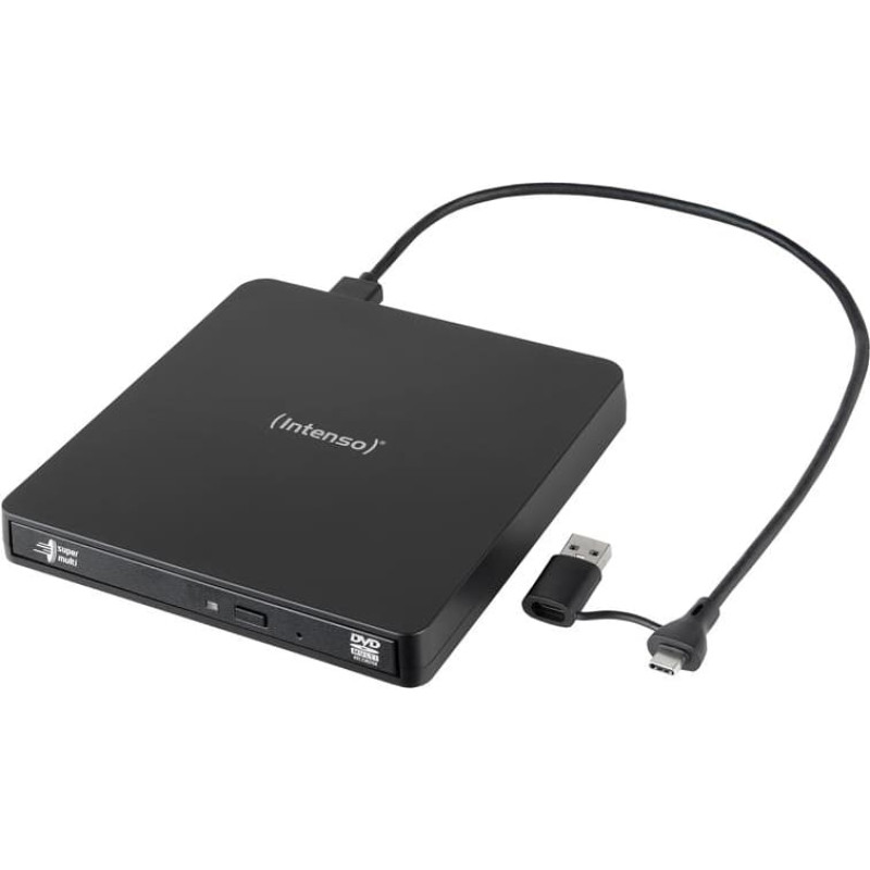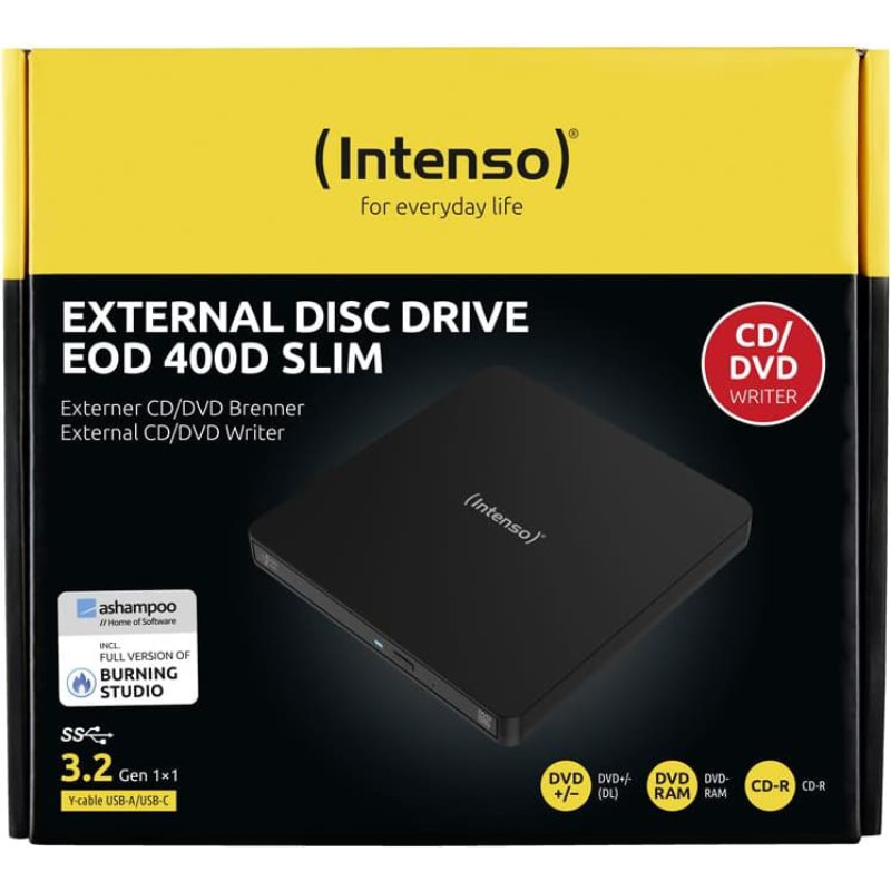 summary: Intenso EOD 400D Slim. Product colour: Black, Disc loading type: Front. Purpose: Desktop/Laptop, Optical drive type: DVD Super Multi DL, Interface: USB 3.2 Gen 1 (3.1 Gen 1). CD write speed: 24x, DVD+R write speed: 8x, DVD-R write speed: 8x. Width: 142 mm, Depth: 148 mm, Height: 16 mm. Quantity per pack: 1 pc(s), Bundled software: Ashampoo Burning Studio