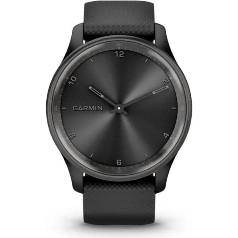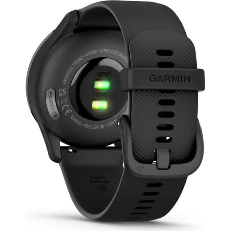summary: Garmin vivomove Trend. Display technology: LCD, Display resolution: 254 x 346 pixels, Touchscreen. GPS (satellite). Weight: 28.3 g. Waterproof up to: 50 m, Band material: Silicone, Band colour: Black