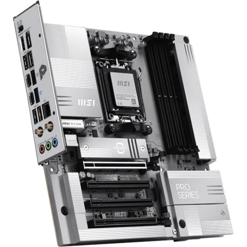 summary: MSI AM5 PRO B850M-A WIFI PZ M-ATX. Processor manufacturer: AMD, Processor socket: Socket AM5, Compatible processor series: AMD Ryzen 7000 Series, AMD Ryzen 8000 Series, AMD Ryzen 9000 Series. Supported memory types: DDR5-SDRAM, Maximum internal memory: 256 GB, Memory slots type: DIMM. Supported storage drive interfaces: M.2, Supported storage drive types: HDD & SSD, RAID levels: 0, 1, 10. Ethernet interface type: 5 Gigabit Ethernet, Top Wi-Fi standard: Wi-Fi 7 (802.11be), Wi-Fi standards: 802.11a, 802.11b, 802.11g, Wi-Fi 4 (802.11n), Wi-Fi 5 (802.11ac), Wi-Fi 6 (802.11ax), Wi-Fi 6E.... Component for: PC, Motherboard form factor: micro ATX, Motherboard chipset family: AMD