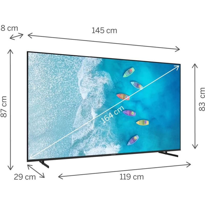 summary: Thomson 65UG4S15. Display diagonal: 165.1 cm (65"), Display resolution: 3840 x 2160 pixels, HD type: 4K Ultra HD, Display technology: LED, Screen shape: Flat, LED backlighting type: Direct-LED. Smart TV. Native aspect ratio: 16:9. Digital signal format system: DVB-C, DVB-S, DVB-S2, DVB-T, DVB-T2. Wi-Fi, Ethernet LAN. Product colour: Black