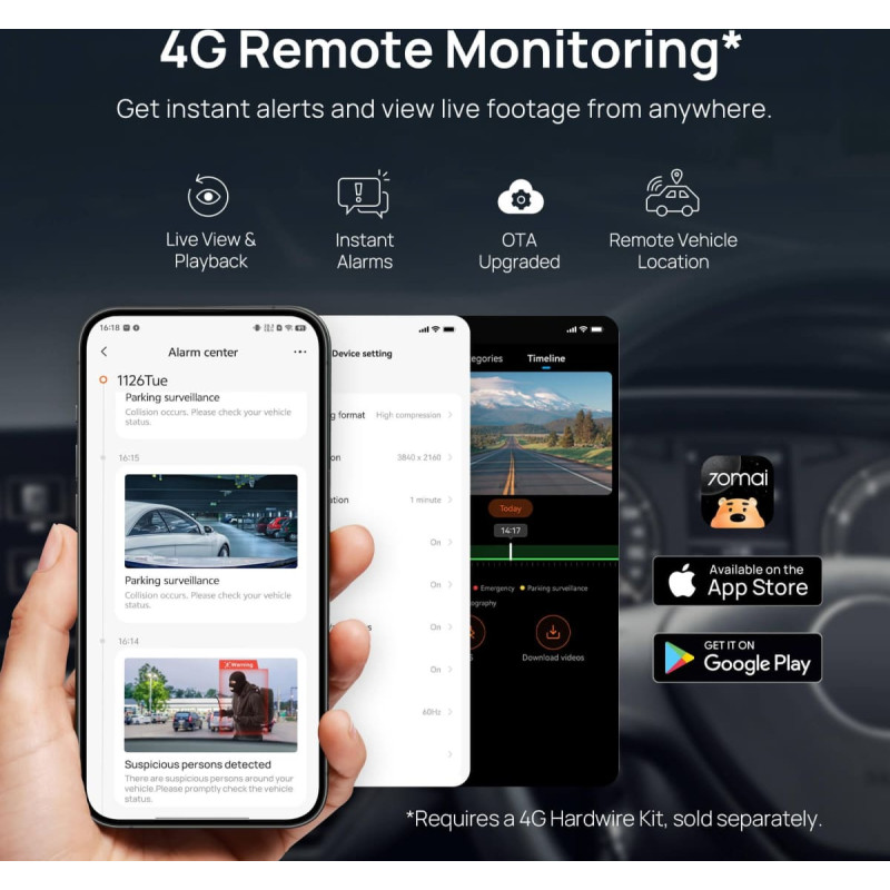 summary: 70mai A810S. HD type: 4K Ultra HD, Main camera resolution: 3840 x 2160 pixels, Main camera viewing angle: 146°. Display: IPS, Display diagonal: 7.62 cm (3"). Compatible memory cards: MicroSD (TransFlash), Maximum memory card size: 512 GB. Wi-Fi standards: Wi-Fi 6 (802.11ax). Power source type: Cigar lighter