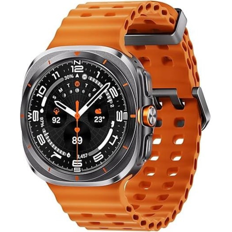 summary: Samsung Galaxy Watch Ultra. Display diagonal: 3.81 cm (1.5"), Display technology: AMOLED, Display resolution: 480 x 480 pixels, Touchscreen. RAM capacity: 2000 MB, Flash memory: 64 GB. Wi-Fi. GPS (satellite). Battery capacity: 590 mAh. Weight: 60.5 g. Band colour: Orange. Operating system installed: Wear OS