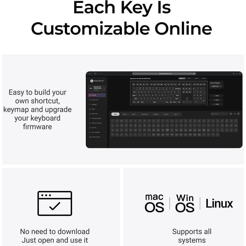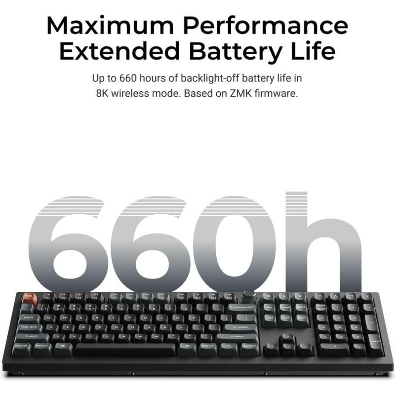 summary: Keychron V6 Ultra 8K. Keyboard form factor: Full-size (100%). Keyboard style: Straight. Connectivity technology: Wired & Wireless, Device interface: Bluetooth, Keyboard key switch: Mechanical, Keyboard layout: QWERTY. Backlight type: RGB LED. Recommended usage: Universal. Product colour: Black