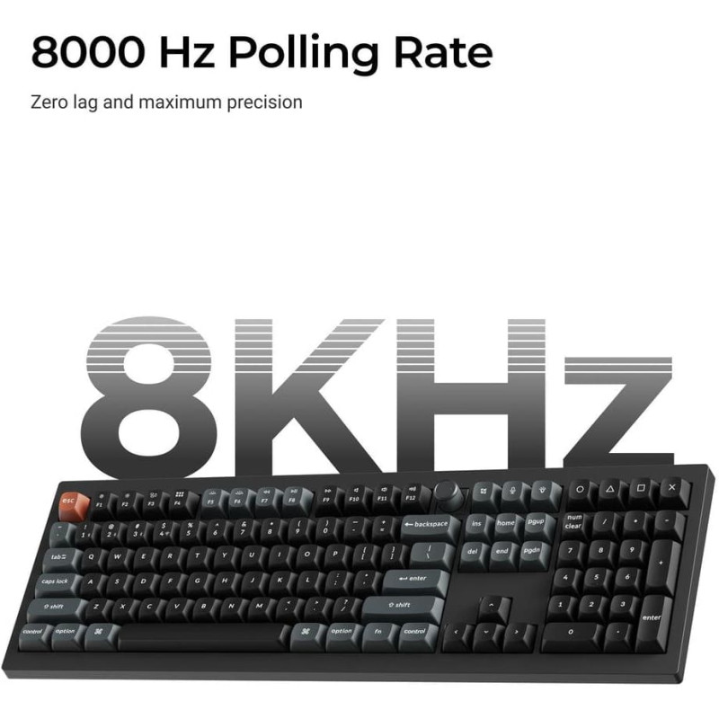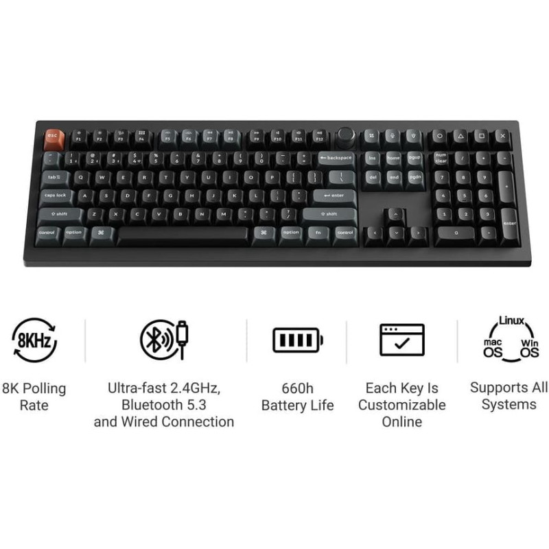 summary: Keychron V6 Ultra 8K. Keyboard form factor: Full-size (100%). Keyboard style: Straight. Connectivity technology: Wired & Wireless, Device interface: Bluetooth, Keyboard key switch: Mechanical, Keyboard layout: QWERTY. Backlight type: RGB LED. Recommended usage: Universal. Product colour: Black