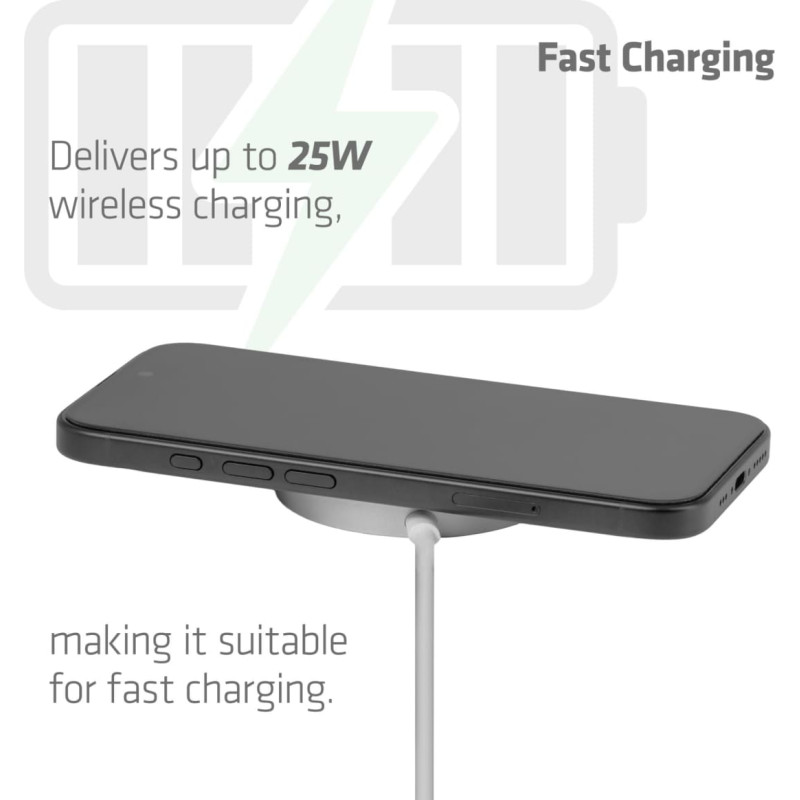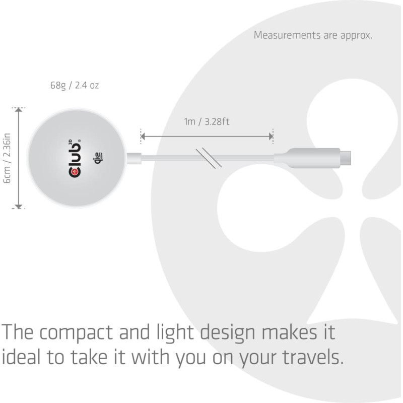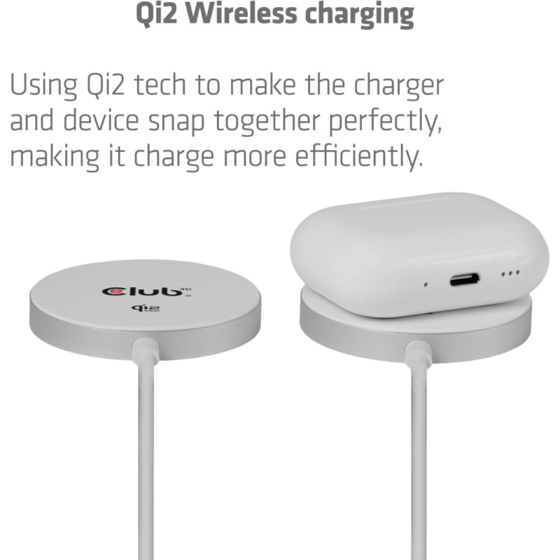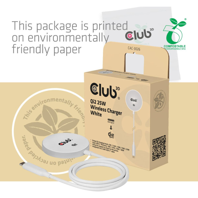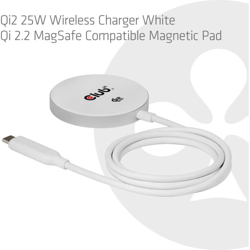 summary: CLUB3D CAC-3026 Qi2 25W Wireless Charger White Qi 2.2 MagSafe Compatible Magnetic Pad. Charger type: Indoor, Power source type: USB, Charger compatibility: Mobile phone, Smartphone, Wireless charging, Fast charging, Power protection features: Over voltage, Under voltage. Cable length: 1 m, Product colour: White