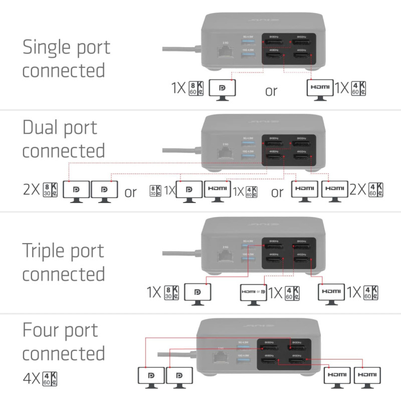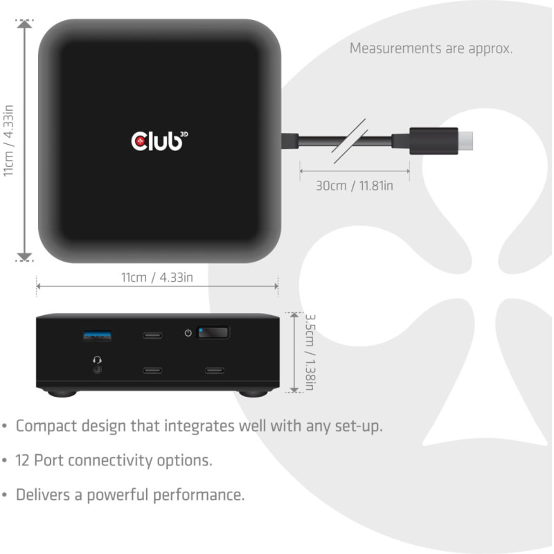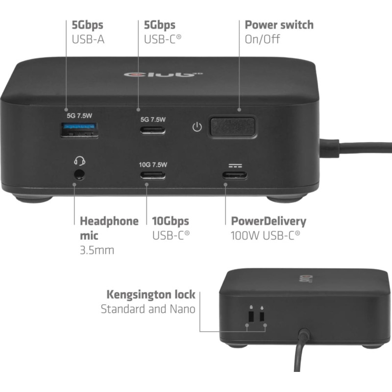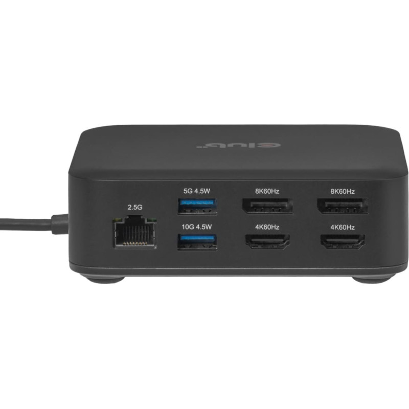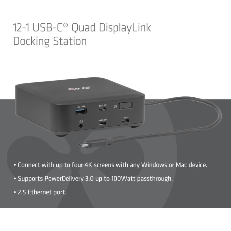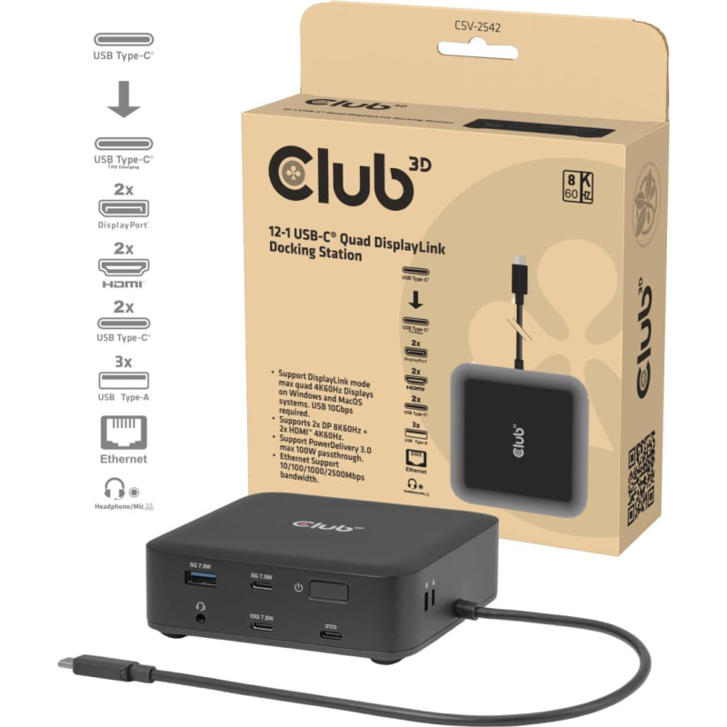 summary: CLUB3D CSV-2542 12-1 USB-C® Quad DisplayLink Docking Station 2x Display- Port™ 8K60Hz + 2x HDMI™ 4K60Hz PD3.0 100Watt Ethernet 2.5G. Connectivity technology: Docking, Host interface: USB 3.2 Gen 2 (3.1 Gen 2) Type-C, USB Power Delivery up to: 100 W. Ethernet LAN data rates: 10,100,1000,2500 Mbit/s. Product colour: Black, Data transfer rate: 10 Gbit/s, HD type: 8K Ultra HD. Windows operating systems supported: Windows 11, Mac operating systems supported: Mac OS X 15.0 Sequoia. Width: 110 mm, Depth: 110 mm, Height: 35 mm