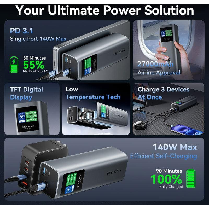 summary: Vention 27000mAh Power Bank 140W. Battery capacity: 27000 mAh, Fast charging technology: Adaptive Fast Charging, Power Delivery 3.0, Power Delivery 3.1, Quick Charge 3.0, Battery voltage: 22.2 V. USB Type-A output ports: 1, USB Type-C ports quantity: 2. Total output power: 140 W. Product colour: Grey