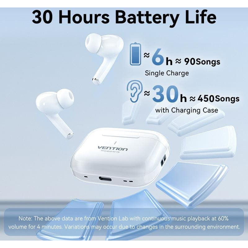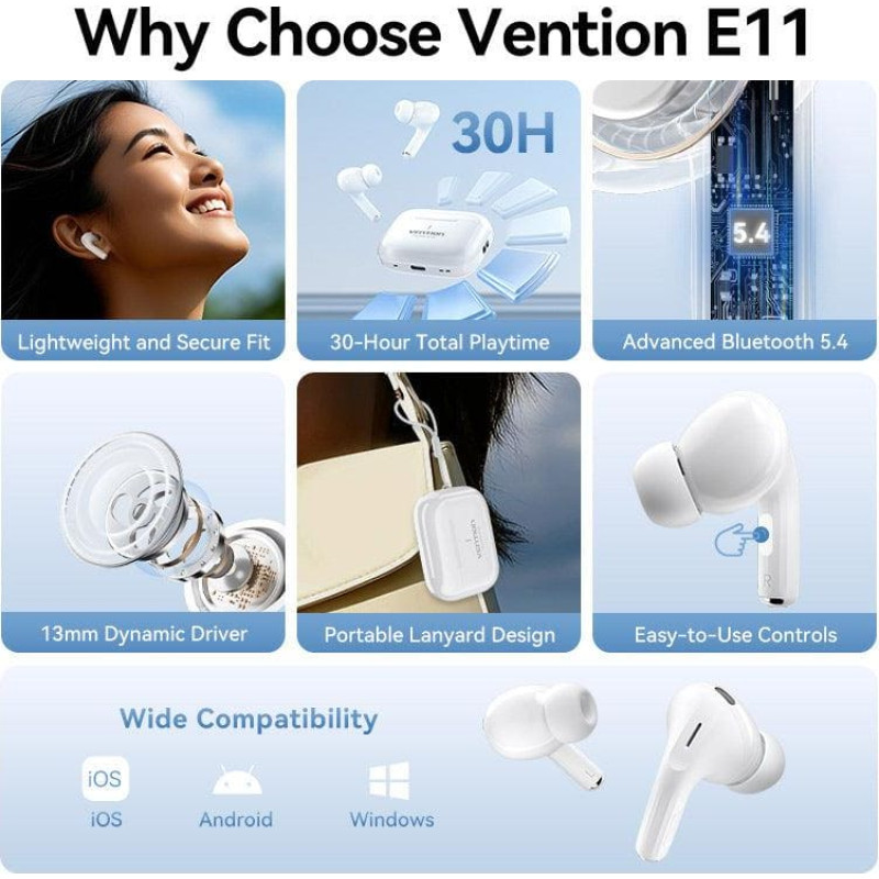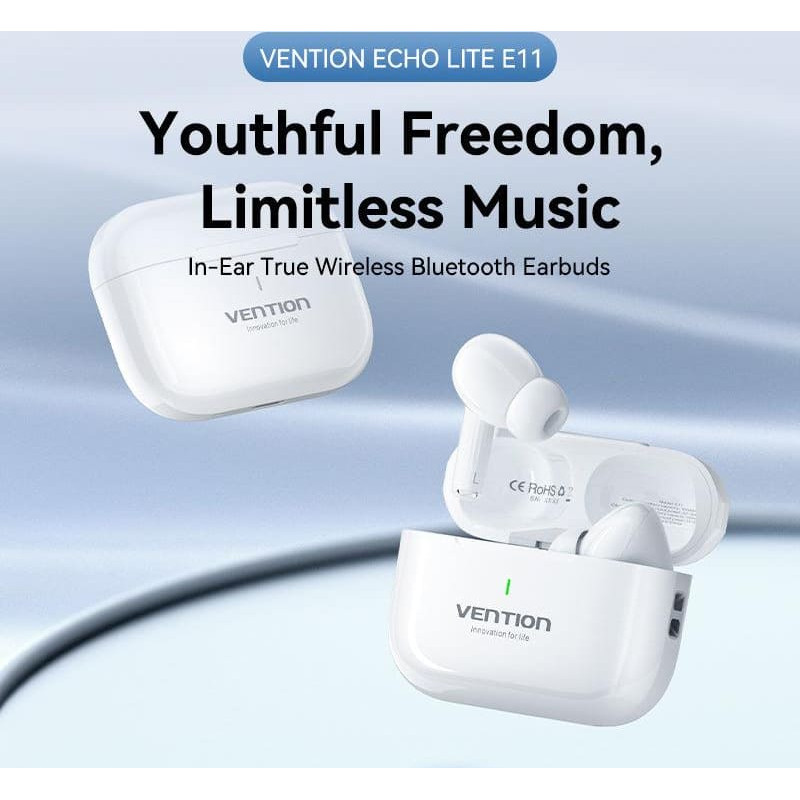 summary: Vention Echo Lite E11. Product type: Headset. Connectivity technology: True Wireless Stereo (TWS), Bluetooth. Recommended usage: Calls/Music. Wireless range: 10 m. Cable length: 0.25 m, Product colour: White