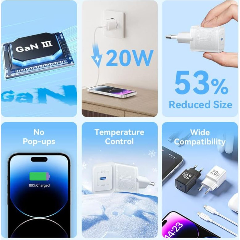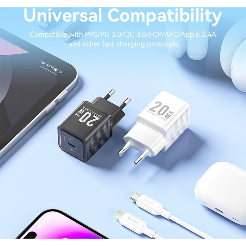 summary: Vention 1-Port USB-C GaN Charger (20W) with USB-C to USB-C Cable. Charger type: Indoor, Power source type: AC, Charger compatibility: Universal. Input voltage: 100 - 240 V, Maximum output voltage: 12 V, AC adapter output current: 3 A. USB Type-C ports quantity: 1, Fast charging, Power protection features: Overheating, Over current, Over power, Short circuit, Over voltage. Cable length: 1 m, Product colour: White