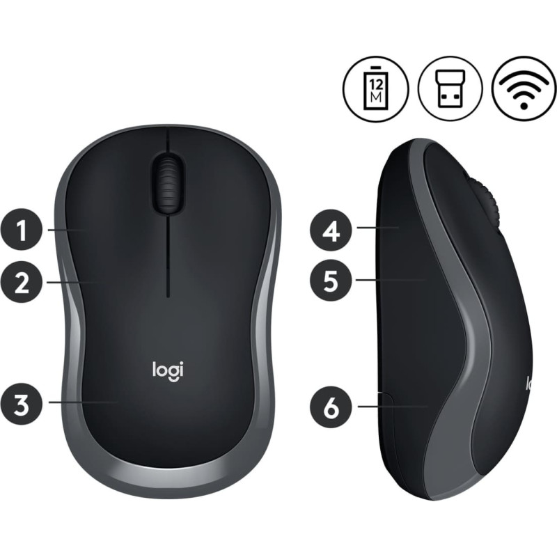 summary: Logitech Wireless Mouse M185. Form factor: Ambidextrous. Movement detection technology: Optical, Device interface: RF Wireless, Movement resolution: 1000 DPI, Buttons type: Pressed buttons, Buttons quantity: 2, Scroll type: Wheel. Power source: Batteries. Product colour: Grey