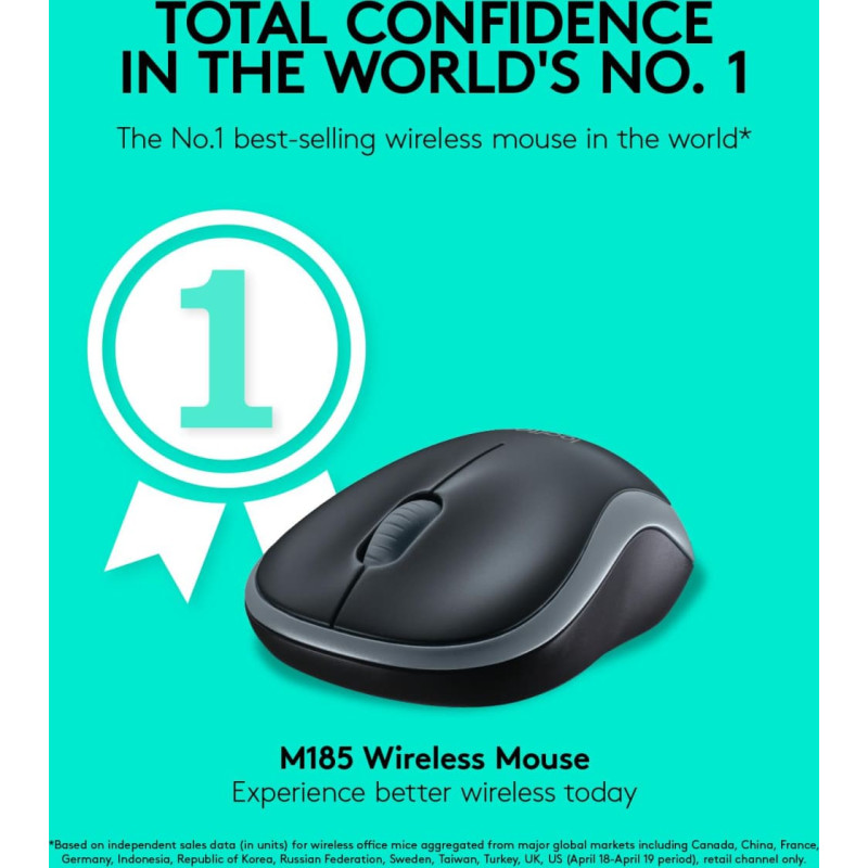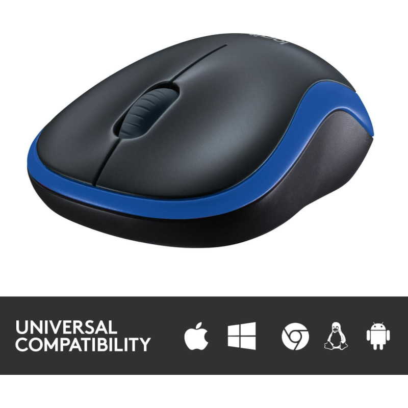summary: Logitech Wireless Mouse M185. Form factor: Ambidextrous. Movement detection technology: Optical, Device interface: RF Wireless, Movement resolution: 1000 DPI, Buttons type: Pressed buttons, Buttons quantity: 3, Scroll type: Wheel. Power source: Batteries. Product colour: Blue
