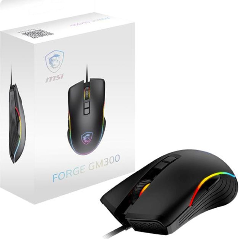 summary: MSI FORGE GM300. Form factor: Ambidextrous. Movement detection technology: Optical, Device interface: USB Type-A, Movement resolution: 7200 DPI, Buttons type: Pressed buttons, Buttons quantity: 7, Scroll type: Wheel. Power source: Cable. Product colour: Black
