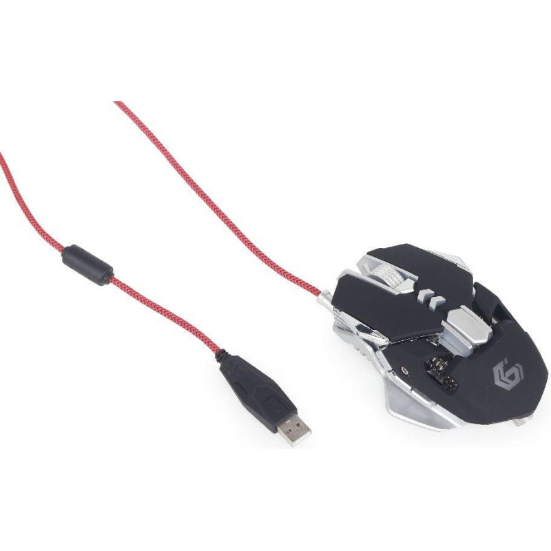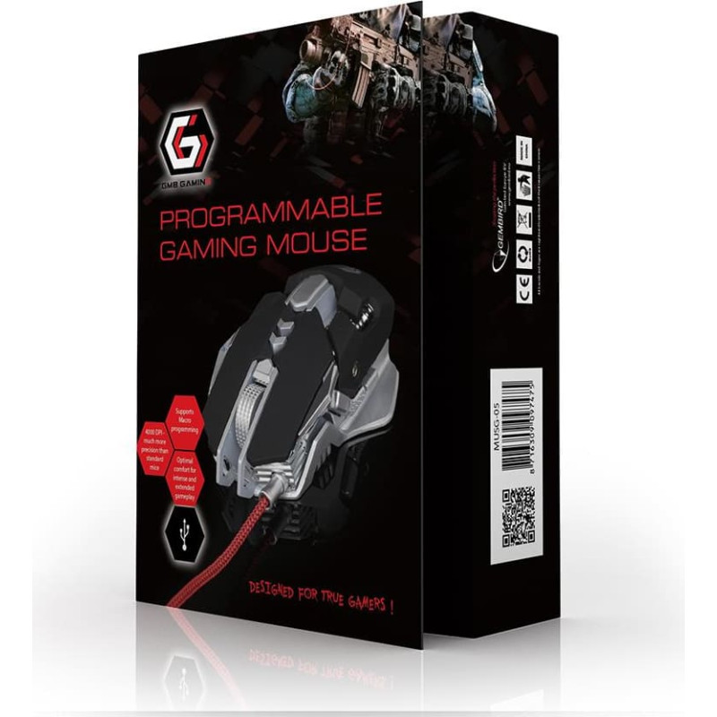 summary: Gembird MUSG-05. Device interface: USB Type-A, Movement resolution: 4000 DPI, Buttons type: Pressed buttons, Buttons quantity: 7, Scroll type: Wheel, Acceleration (max): 16 G. Power source: Cable. Product colour: Black, Silver