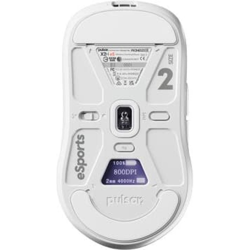 summary: PULSAR [White Edition] X2H eS Medium Gaming Mouse. Form factor: Ambidextrous. Movement detection technology: Optical, Device interface: RF Wireless + USB Type-C, Movement resolution: 26000 DPI, Buttons type: Pressed buttons, Scroll type: Wheel, Acceleration (max): 50 G. Power source: Batteries/Cable. Product colour: White