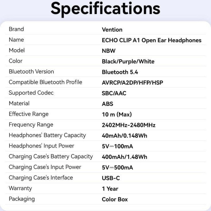summary: Vention ECHO CLIP A1. Product type: Headset. Connectivity technology: Wireless, Bluetooth. Recommended usage: Calls/Music/Sport/Everyday. Wireless range: 10 m. Product colour: Black