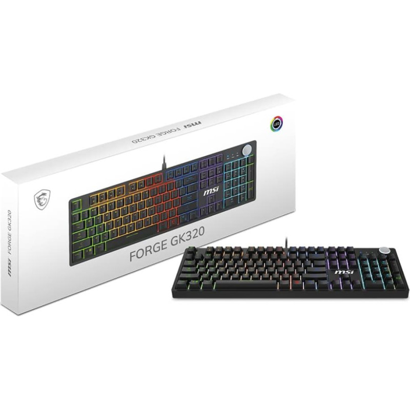 summary: MSI FORGE GK320 RED. Keyboard form factor: Full-size (100%), Connectivity technology: Wired, Device interface: USB, Keyboard key switch: Mechanical, Keyboard layout: QWERTY. Backlight type: RGB LED. Cable length: 1.6 m. Recommended usage: Gaming. Product colour: Black